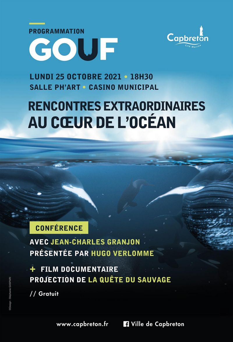 À la fois réalisateur, plongeur professionnel, biologiste marin et auteur de " Initiation Pacifique, rencontres avec les êtres de l'eau ", Jean-Charles Granjon sera l'invité de cette rencontre. Il est aujourd'hui l'un des meilleurs caméramen sous-marins. Après la projection de son superbe film documentaire " La quête du sauvage " narrant la rencontre de Morgan Bourc'his, champion du monde d'apnée, avec les orques, il nous parlera de son métier et de ses rencontres avec des cétacés, des requins, des poissons extraordinaires.