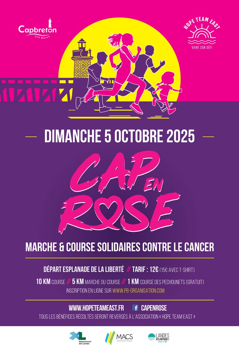 À lʼoccasion de la campagne nationale « Octobre Rose », la Ville de Capbreton organise, le dimanche 5 octobre 2025, en lien avec l'association HOPE TEAM EAST, la huitième édition de « CAP EN ROSE », marche et courses solidaires contre le cancer du sein.
