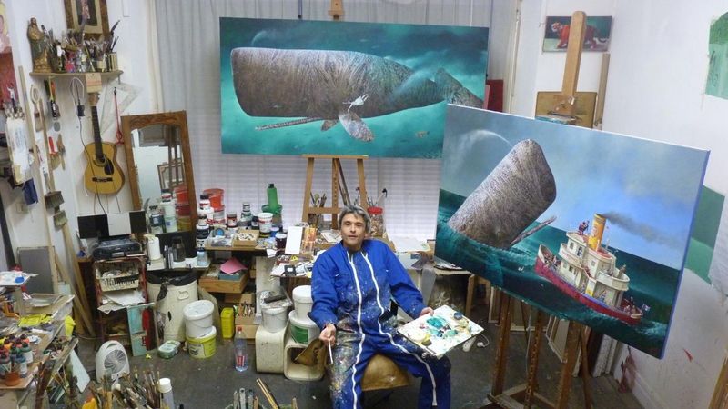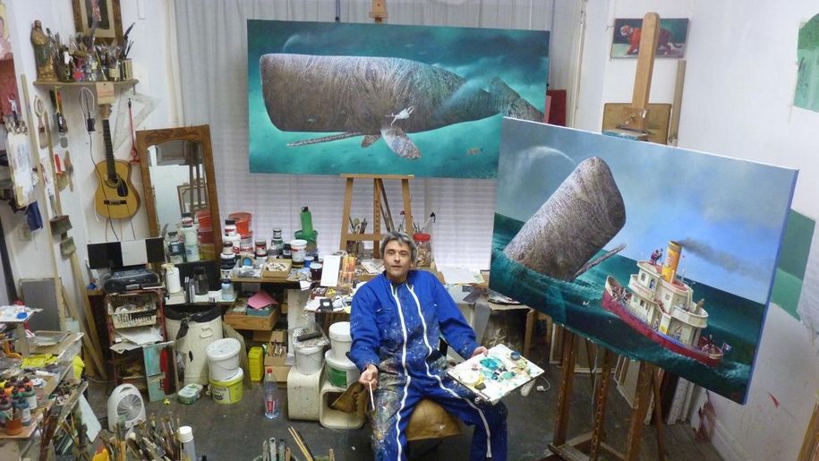 " Mieux vaut être accompagné si l'on veut s'aventurer et savoir ce qui se trouve en dessous de la fine membrane transparente qui sépare l'air de l'eau, le ciel de la mer, l'atmosphère des abysses. Jusqu'où vont les profondeurs des océans ? On les a mesurées, scannées, cartographiées...des milliers de mètres, mais pour moi, ils restent plus abstrait que l'espace sidérale. Alors quoi de mieux que d'être accompagné par un cétacé pour s'y aventurer.. Car c'est bien à quoi je pense quand je peins mes baleines imaginaires et autres bestiaires aquatiques. La baleine, cet animal géant en suspend dans un vide amniotique me fascine totalement par sa forme, sa force, son volume, son aspect quasi minéral, sa grande mansuétude et sa présence. "